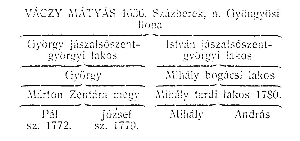 Ezekből az iratokból megállapítható, hogy 11. Ferdinánd Bécsben 1636. évi február 1-én kelt oklevelével a török háborúban szerzett vitézi érdemeiért Váczy Mátyást, valamint a neje Gyöngyössy Helénával kötött házasságából származott György és István nevű fiait, úgyszintén testvérét, Váczy Pétert és felesége Torma Priskát Jászberényből magyar nemességgel jutalmazta meg.*[1]
